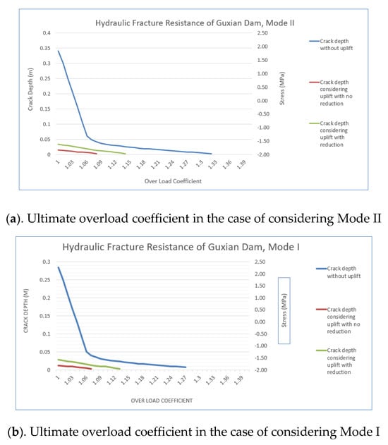 The analysis results indicate that Mode I (tensile failure) poses a higher risk to the Guxian dam compared to Mode II (shear failure). The ultimate overload coefficient without considering uplift, which represents the dam’s resistance to hydraulic fracture, is lower in Mode I (1.27) than in Mode II (1.32). This confirms that the dam has more resistance to hydraulic fracture in Mode II, supporting the theory that tensile stresses, which dominate Mode I, lead to a weaker overall resistance. The higher fracture energy observed in Mode II compared to Mode I can be attributed to the fundamental mechanisms of crack propagation in concrete. Mode I, the tensile opening mode, typically initiates a relatively clean crack (the crack tends to open directly and smoothly) with minimal resistance once the tensile strength is exceeded. By contrast, Mode II involves in-plane shear displacement along the crack surface, which engages a wider fracture process zone. Within this zone, several energy-absorbing mechanisms become active, including the formation of inclined tensile microcracks, sliding, and friction between aggregate particles, and the interlock of rough crack surfaces. These mechanisms significantly increase the energy required for the crack to propagate in shear. Aggregate interlock plays a particularly crucial role, as the asperities along the crack faces generate frictional resistance that must be overcome for sliding to occur. Additionally, the presence of residual cohesion across the crack plane further contributes to Mode II’s higher fracture toughness. These factors collectively result in fracture energies for Mode II that are typically 20 to 25 times greater than those for Mode I, as documented in the studies by [,]. This theoretical understanding aligns with the current study’s numerical results, where the ultimate overload coefficient in Mode II was higher, indicating greater resistance to hydraulic fracture in shear-dominated failure scenarios. The lower ultimate overload coefficient for Mode I reflects the increased vulnerability of the dam to crack initiation and propagation under tensile stress, making Mode I the more critical failure mode. Both modes of failure can happen together, but usually Mode I has the higher possibility to occur first, and in different locations, and could expose more risk to the dam safety.