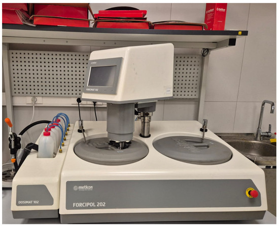 Grinding and polishing system FORCIPOL 202 with FORCIMAT 102 and DOSIMAT 102 (Metkon, Turkey).