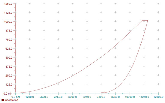 In this study, several physical parameters were evaluated, including Vickers microhardness, Young’s modulus, and relative elastic deformation work. Indentational hardness reflects the material’s ability to resist irreversible deformation or fracture under load. Microhardness was assessed under a maximum load of 1 N, consistent with standard microindentation protocols. Calculations were based on the Vickers method (HV), relating the applied load to the contact area of the indentation produced by a Berkovich-type diamond tip. The results obtained from the instrumented indentation were converted to Vickers hardness values using an established geometric correlation between the Berkovich and Vickers indenters.