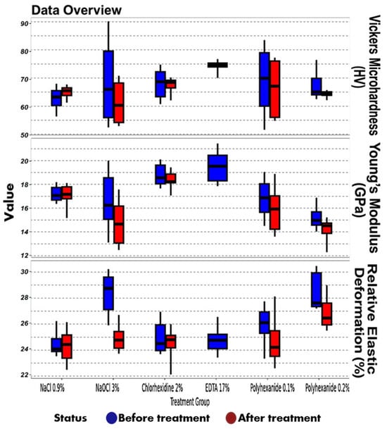Boxplot distributions of Vickers microhardness (HV), Young’s modulus (GPa), and relative elastic deformation work (%) in dentin samples before and after chemical treatment. Six experimental groups are shown: 0.9% NaCl, 3% NaOCl, 2% chlorhexidine, 17% EDTA, 0.1% polyhexanide, and 0.2% polyhexanide. Blue boxplots represent values before treatment; red boxplots represent values after treatment.