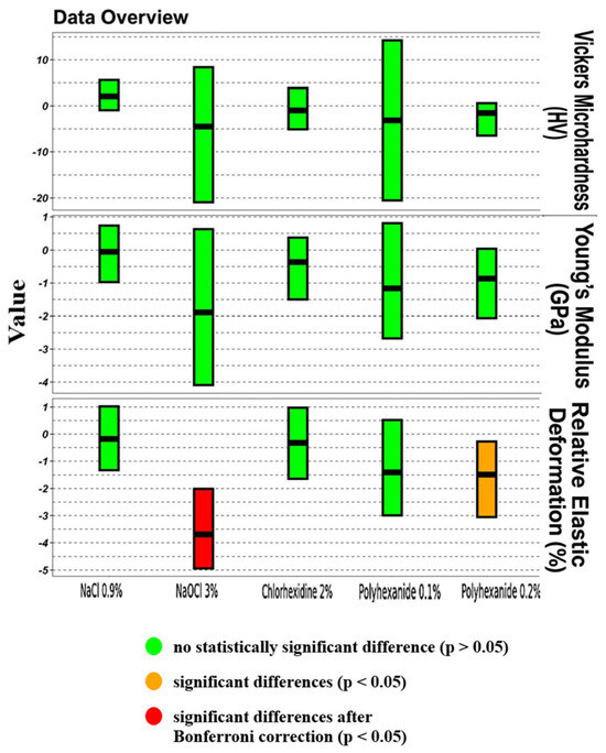 Differences in Vickers microhardness (HV), Young’s modulus (GPa), and relative elastic deformation work (%) in dentin samples after chemical treatment compared to baseline. Green bars indicate no statistically significant difference (p > 0.05); red bars indicate significant differences (p < 0.05); orange bars indicate significant differences after Bonferroni correction (p < 0.05).
