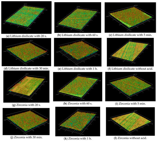 The profilometer observations of the prepared lithium disilicate and zirconia surfaces treated with acid for 20 s, 60 s, 5 min, 30 min, 1 h, and no acid (control group) are shown in Figure 1. The three-dimensional images generally reveal that prolonged acid application results in a progressively rougher surface. The smoothest surface was observed in the control group, which did not receive acid treatment.