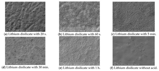 Longer etching times increase ceramic surface roughness and wettability. Short etching times produce small holes, whereas extended ones create uneven grooves and deeper pores. Some modern methods use modest heat or agitation to create effective roughness in 30–60 min, making clinical application more practical [19]. Extended etching (e.g., 160 s) dissolves the matrix around crystals, leading to protruding crystal structures and elongated, randomly oriented lithium disilicate crystals measuring approximately 2.56–2.97 μm [28,35,36,37]. In our study, the etching solution produced non-selective removal of crystals and glass matrix, probably due to the synergistic action of the components (Figure 1b,d,e,f,h,j,l) [29,32].