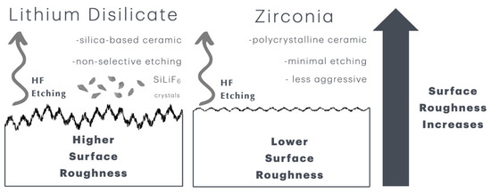 Schematic diagram of the mechanism of action of HF etching on lithium disilicate (left) and zirconia (right) surfaces. The silica-based composition of lithium disilicate is highly sensitive to the highly concentrated etching solution, producing rougher surfaces but with damage to and substantial loss of structure. The polycrystalline nature of 5Y-TZP zirconia surfaces is more resistant to etching, but the synergistic action of the components of the etching solution produces less aggressive, minimal etching with increased surface roughness.