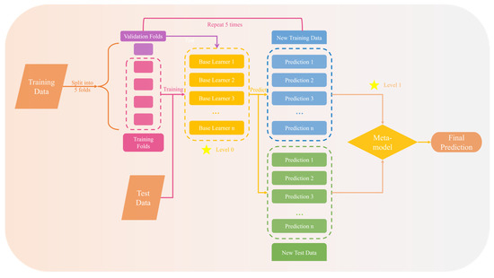 To reduce errors from bias and variance in different machine learning algorithms, ensemble methods can be used to combine the results of multiple algorithms. Bagging constructs multiple sub-datasets through the bootstrap sampling of the original training data, trains multiple base learners separately on these sub-datasets, and then combines the predictions of these base learners. Random forest is the most typical algorithm based on bagging. Boosting is an iterative algorithm. In each training round, it adjusts sample weights according to the previous base learner’s performance, so that the base learner can focus more on samples mispredicted in the previous round, thereby enhancing model performance step by step. Algorithms like Adaboost and XGBoost are based on boosting [18,20,22]. Stacking uses a meta-learner that blends various basic ML models to enhance accuracy [23,24,25]. The stacking process has two stages: first, train multiple models and combine each model’s output or prediction into a new dataset; second, apply a “meta-learning algorithm” to generate the final result [26].