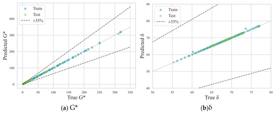 Figure 2 illustrates the high prediction accuracy of the stacking model when dealing with unseen data, revealing a significant correlation between the predicted and true values of G* and δ for both the training and test sets. The data points are closely aligned with the 45-degree line, indicating that the model’s predictions are highly accurate. Additionally, the dashed lines representing the ±35% error range show that the whole predictions fall within this acceptable error margin, further highlighting the model’s precision.