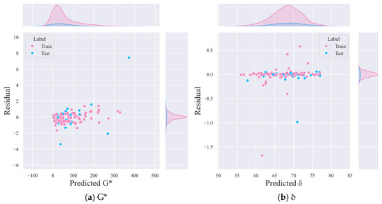 Figure 3 provides a residual analysis for both G* and δ, showing that the residuals are evenly distributed and centered around zero. The density plots on the sides of the residual plots indicate a high density of zero error, suggesting that the model’s prediction errors are minimal. This uniform distribution of residuals and the high density of zero errors demonstrate the reliability of the model’s predictions, confirming that the stacking model is capable of producing consistent and accurate results across different datasets.
