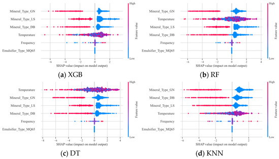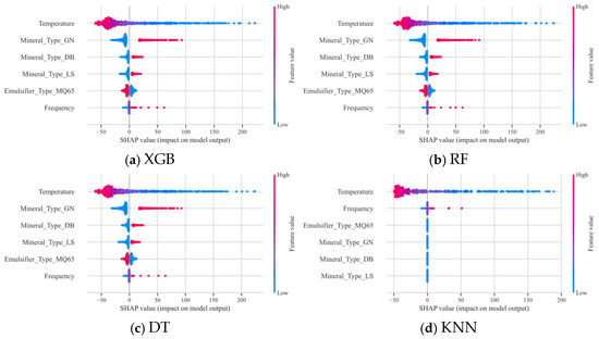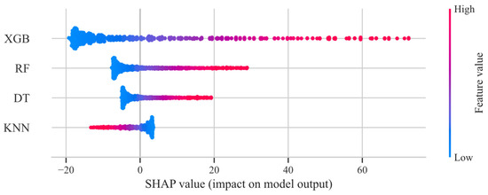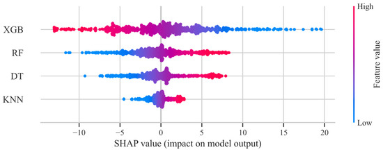 Similarly, for δ, as shown in Figure 7, the SHAP values of XGB exhibit the widest distribution range, spanning from −15 to 20, indicating its outstanding status. In addition, the values of the remaining three models are approximately symmetrically distributed around 0. The rest of the distribution is similar to that of G* and will not be discussed further here.