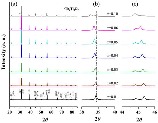 (a) Room-temperature XRD patterns of (Ba1−xTbx)(Ti1−xHox)O3 (BTTH) ceramics, and magnified diffraction peaks at (b) 39° and (c) 45°.