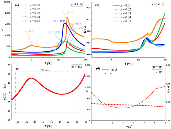 (a) Real part of permittivity (ε′), (b) loss (tan δ) of BTTH ceramics, and (c,d) dielectric performance of x = 0.02.