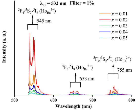 Figure 5 exhibits the photoluminescence spectra of BTTH samples upon the excitation of the 532 nm laser line. There are three PL bands located around 545, 653, and 755 nm with different intensities in the wavelength range of 500~800 nm. Kumar et al. examined the PL spectra of Ho3+ in alkali bismuth gallate glasses using excitation wavelengths of 488 and 450 nm [28]. They reported three PL bands: the strong green emission located at 545 nm is assigned to the 5F4/5S2 → 5I8 transition, and the weak red emissions located at 662 and 756 nm are attributed to 5F5 → 5I8 and 5S2 → 5I7 transitions [28]. Babu et al. reported a similar result of Ho3+ as a luminescence center in multicomponent fluorophosphate-based glasses [29]. Battisha and Secu et al. studied Ho-doped BaTiO3 ceramics and declared that Ho3+ is mainly substituted for the Ba sites under the low sintering temperature [30,31]. They observed four luminescence bands at 435, 545, 660, and 760 nm, respectively, and the last three bands were associated with the 5F4/5S2 → 5I8, 5F5 → 5I8 and 5F4/5S2 → 5I7 transitions, respectively. Based on the above discussion, the observed PL spectra of BTTH ceramics in this paper are associated with Ho3+ ions at Ba sites. Lu et al. reported three PL bands at 545, 653, and 755 nm and also assigned them to the 5F4/5S2 → 5I8, 5F5 → 5I8, and 5F4/5S2 → 5I7 transitions of Ho3+ ions on the Ba sites [32]. Makovec et al. investigated the solubility and site occupancy of Ho ions in BaTiO3 and drew the conclusion that the solubility limit of Ho3+ ions on Ba sites is less than 1.4% at the sintering temperature of 1400 °C in the TiO2-rich samples, and Ho3+ ions entered the Ti sites in BaO-rich samples [33]. The results of Makovec et al. convincingly proved that Ho3+ ions possess an amphoteric behavior of site occupancy, which is influenced by the ratio of Ba/Ti. In Figure 5, the PL intensity of x = 0.02 is much higher than that of x = 0.01, suggesting a higher concentration of Ho3+ at Ba sites with increasing doping content. However, the PL intensity decreases dramatically when x > 0.02, suggesting that Ho3+ ions at Ba sites are strongly suppressed. Since there is no impurity phase that contains the Ho element in XRD spectra, it is therefore reasonable to suppose that Ho3+ ions prefer to occupy Ti sites at higher doping levels.