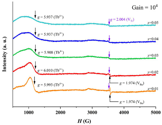 Figure 6 shows room temperature EPR spectra of BTTH ceramics, and three signals at g = 1.974, 2.004, and 6.010 are observed. The g = 1.974 signal is assigned to ionized Ba vacancy defect () [34,35], which only exists in x = 0.01 and 0.02. For the weak signal, g = 2.004, which is associated with Ti vacancies () [35], can be observed in all samples. A broad signal is located at g = 5.908~6.010 and is attributed to the electron paramagnetic resonance caused by Tb4+ (4f7, 8S7/2) Kramers ions at Ti sites () [25]. The intensity of the Tb4+ signal decreases with increasing doping content, suggesting that the concentration of Tb4+ ions incorporated into Ti sites decreases with increasing doping level. Because no impurity phase is observed in XRD results for x ≤ 0.05, which means that Tb ions completely enter the BaTiO3 lattice, the decrease in the Tb4+ signal in Figure 6 suggests that more and more Tb ions occupy the Ba sites as Tb3+ [12]. In this study, Tb ions are designed to occupy the Ba sites to compensate for the Ti-site Ho ions, and this compensation mechanism will be partly broken when Tb occupies the Ti sites as Tb4+. Ba or Ti vacancies will be produced to compensate the Ba-site rare-earth ions. For x = 0.01, the quantity of is larger than other samples; therefore, the largest quantity of Ba vacancies in x = 0.01 is reasonable. With the decrease in the Tb4+ EPR peak and more Tb3+ ions occupying the Ba sites, it is easy to understand the decrease in the Ba vacancy signal. The above results provide solid evidence of multivalent states and amphoteric behavior of site occupancy of Tb ions in BTTH ceramics.