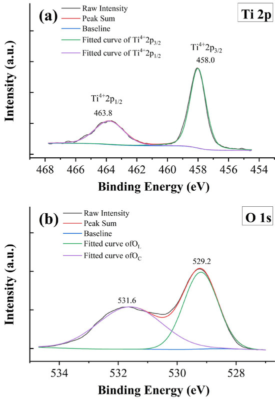 XPS measurement is employed to gain a better understanding of the valences of Tb ions. Figure 7 shows the raw data and fitting results of XPS spectra for sample x = 0.05. Figure 7a presents the data for the Ti-2p core level, which contains two main peaks originating from the spin-orbit splitting of Ti 2p1/2 and Ti 2p3/2. The data are fitted with a combination of Gaussian–Lorentzian functions, and only two peaks located at 463.8 and 458.0 eV are obtained. These peaks are identified as a complete Ti4+ state, suggesting that the Ti3+ state is absent and all Ti ions are tetravalent in the samples. The energy separation of these two peaks is 5.8 eV, which is consistent with the previous studies [38]. It is well known that oxygen vacancies are unavoidable in transition metal oxides under high-temperature sintering conditions and low partial oxygen pressure. For example, Sinclair and West pointed out that La-doped BaTiO3 ceramics sintered in an air atmosphere may be oxygen deficient inside the grains [39]. Wang et al. also declared that partial oxidation occurred only in the surface layer of the sample, while the inner part is oxygen deficient [40]. The conducting electrons created by ionization of the oxygen vacancies can be captured by transition metal cations and thus result in the reduction in transition metal cations; for example, Ti4+ is reduced to Ti3+ [41,42]. However, the mixed valence states of Ti ions do not exist in BTTH. To probe the state of the oxygen anion, the 1s core level spectrum of oxygen is also analyzed, and the result is exhibited in Figure 7b. Two peaks are observed at the binding energies of 531.6 and 529.2 eV with an energy separation of 2.4 eV. The XPS spectra of the O 1s core level in BaTiO3 or similar systems have been studied a lot [43,44]. According to the literature, the O 1s spectra are usually asymmetric and can be deconvoluted into three peaks, which are associated with lattice oxygen ions in BaTiO3 (OL), defect oxygen within the BaTiO3 matrix (OD), and loosely bound oxygen from chemisorbed or dissociated surface oxygen species (OC), respectively [43,45]. The energy separation in Figure 7b coincides well with the value of OC with respect to OL [43]; therefore, the XPS spectra of the O 1s core level in this study are assigned to OL and OC, and the defect oxygen species is absent, which is consistent with the tetravalent state of Ti ions. According to the literature, defect oxygen is usually associated with the Ti3+ state [43,44].
