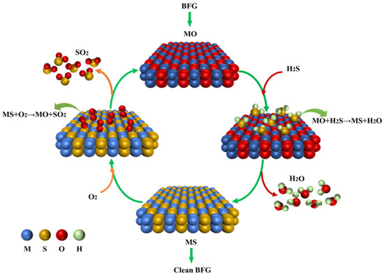 The H2S desulfurization and metal oxide regeneration process is schematically depicted in Figure 1. Initially, the metal oxide undergoes a reaction with the H2S present in BFG, yielding sulfide and water. Subsequently, oxygen introduction facilitates the oxidative regeneration of sulfide back to metal oxide, with SO2 concurrently produced as a byproduct.