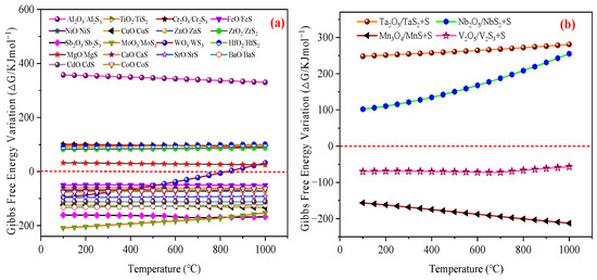 The sulfur-containing reaction products include sulfides (MS) and elemental sulfur (S). Gibbs free energy calculations were performed to evaluate the sulfur-fixation capacity of the candidate metal oxides. Figure 2 illustrates the ΔG profiles for H2S reactions with 22 metal oxides. Notably, Figure 2a reveals that the Al, Ti, Cr, Zr, Hf, and Mg oxides exhibited positive ΔG values across the 100~1000 °C range, indicating thermodynamic infeasibility for H2S removal. Conversely, the Fe, Ni, Cu, Zn, Sb, Mo, Ca, Sr, Ba, Cd, and Co oxides demonstrated negative ΔG values, signifying spontaneous reactivity with H2S under these conditions. WO3 displayed temperature-dependent behavior, with spontaneous reactions occurring between 100~800 °C. The results presented in Figure 2b indicate that the Nb and Ta oxides exhibited positive ΔG values for the H2S reactions across the 100~1000 °C range, whereas the V and Mn oxides demonstrated negative ΔG values, signifying spontaneous reactivity under these conditions.