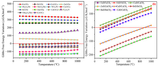 The ∆G variation of the 14 types of metal oxides under different temperatures: (a) The chemical reaction of the metal oxides with CO. (b) The chemical reaction of the metal oxides with CO2.