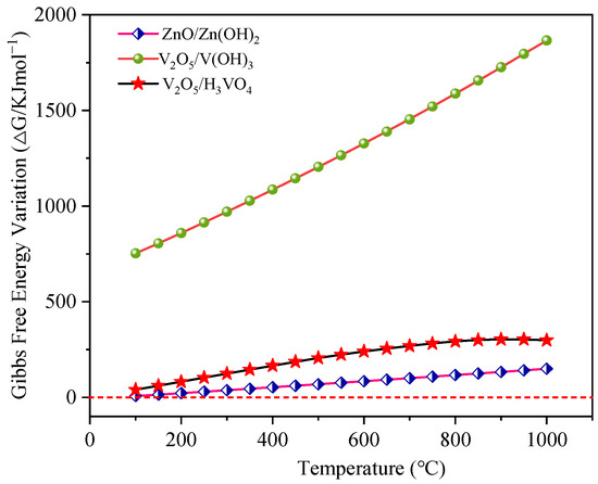 The changes in the ΔG of the Zn and V oxides at different temperatures (when reacting with H2O).