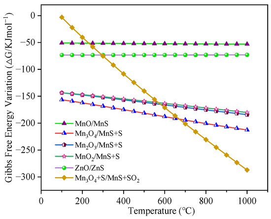 Reactions Equations (21)–(26) involved the further oxidation of MnO to higher-oxidation-state oxides, which gave rise to the subsequent Reactions Equations (27)–(34). When considering MnO alone, Figure 8a illustrates the ΔsG profiles for the MnS regeneration reactions. Figure 8b presents the ΔG changes for the MnO oxidation pathways. Thermodynamic analysis confirmed the thermal instability of MnO2 as Reactions Equations (25) and (26) exhibited a sign change in ΔG near 600 °C, indicating MnO2 decomposition at this temperature threshold.