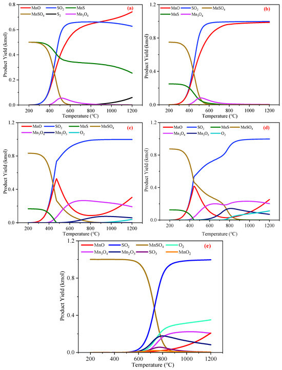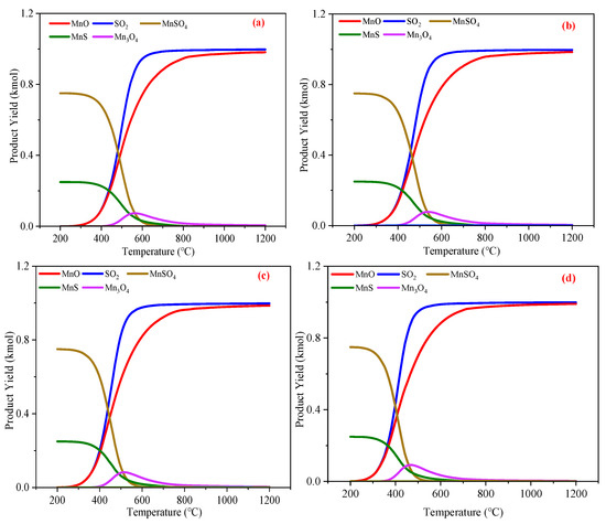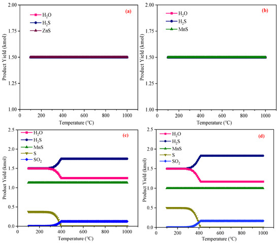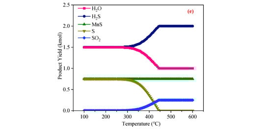 Notably, the data from Figure 7a,b indicate that temperature had no significant impact on the reactions of ZnO and MnO with H2S, as ZnS, MnS, and H2O were consistently produced across the 100~1000 °C range. Conversely, as shown in Figure 7c, the sulfur-containing products of the reaction between Mn3O4 and H2S included MnS, S, and SO2. From 100~300 °C, reaction Equation (5) dominated, yielding 1.125 kmol of MnS, 0.375 kmol of S, and 1.5 kmol of H2O. As the temperature rose from 300 °C to 400 °C, the amount of S in the products decreased gradually, while that of SO2 increased, and the amount of H2S removed by Mn3O4 also declined. By examining the ΔG change in reaction Equation (9), as shown in Figure 6 (the yellow line in Figure 6), it can be elucidated that the S generated from the reaction between Mn3O4 and H2S could be further oxidized to SO2, where S and H2S are in a competitive relationship as reducing agents. With increasing temperature, the ΔG of Equation (9) drops significantly. Moreover, S volatilizes at higher temperatures, and its reactivity is greatly enhanced, making it more prone to oxidation to SO2. Therefore, above 400 °C, elemental S is absent from the products, and the consumption of Mn3O4 by S leads to a reduction in the amount of H2S removed by Mn3O4.
