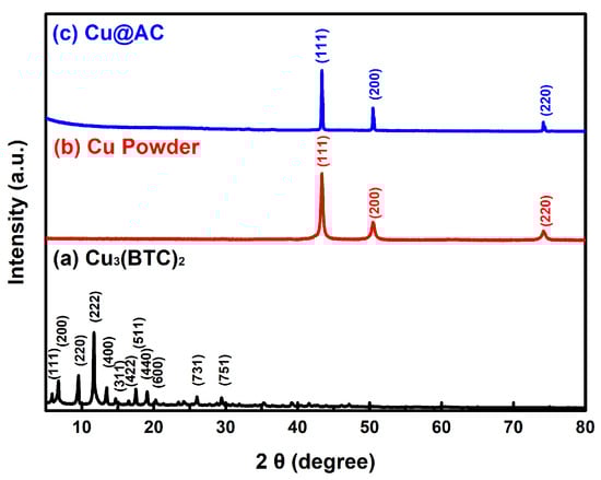XRD patterns of the as-prepared products: (a) Cu3(BTC)2, (b) Cu powder, and (c) Cu@AC.