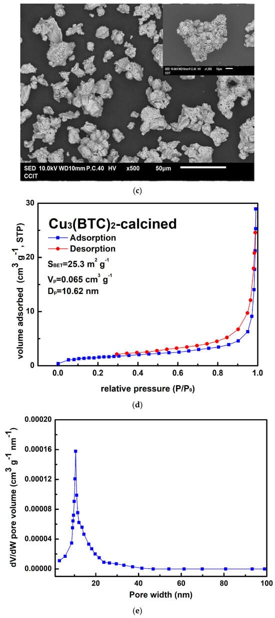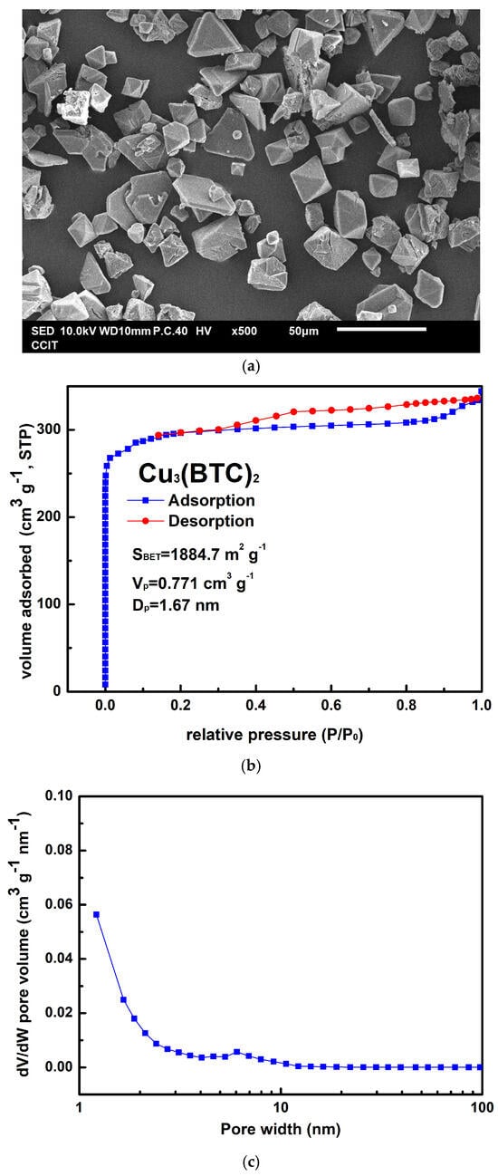 (a) Typical SEM image of Cu3(BTC)2, (b) nitrogen adsorption–desorption isotherm of Cu3(BTC)2, and (c) pore size distribution curve of Cu3(BTC)2.