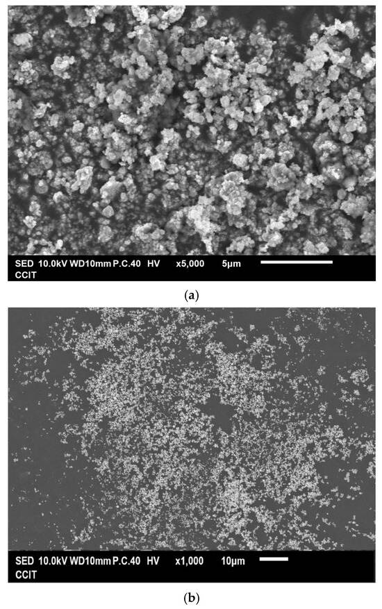 Figure 3a,b show that the as-prepared Cu powder primarily consisted of agglomerated particles ranging in size from 100 nm to 200 nm. This method yielded 63% for the Cu powder, which was determined by the concentration of Cu2+ ions in the raw material. Figure 3c shows the result of the EDS analysis conducted on the prepared Cu powder, revealing the prominent presence of copper (98.2 wt%), along with only a minimal amount of oxygen (1.8 wt%). It is considered that copper readily undergoes oxidation, resulting in the formation of surface oxides; however, these oxides remain undetectable by XRD, as indicated in Figure 1b. Figure 3d presents the isotherm of the sample, categorized as Type III according to the IUPAC classification, characterized by a gradual initial increase in adsorbate uptake, followed by a rapid, exponential increase as the relative pressure rises. Additionally, no hysteresis loop is observed, indicating a reversible process during both adsorption and desorption. The differential pore volume analysis shown in Figure 3e suggests that the agglomerated particles were closely stacked together, with the spaces between them serving as porous structures predominantly composed of micro- and mesopores. The measured values for SBET, Vp, and Dp were 4.1 m2 g−1, 0.029 cm3 g−1, and 28.87 nm, respectively.