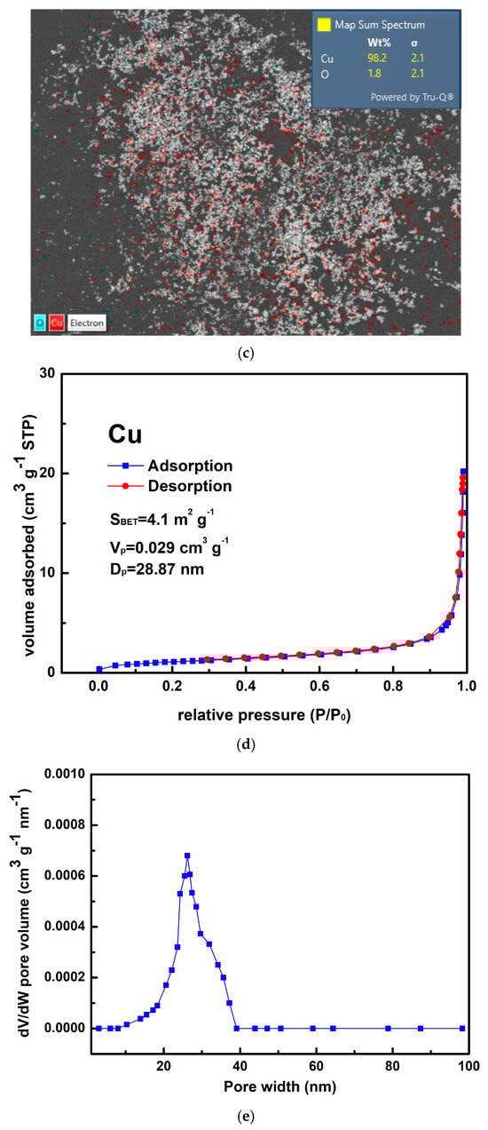 (a,b) Typical SEM images at different magnifications of the Cu powder, (c) the corresponding EDS mapping image, (d) the nitrogen adsorption–desorption isotherm of the Cu powder, and (e) the pore size distribution curve of the Cu powder.