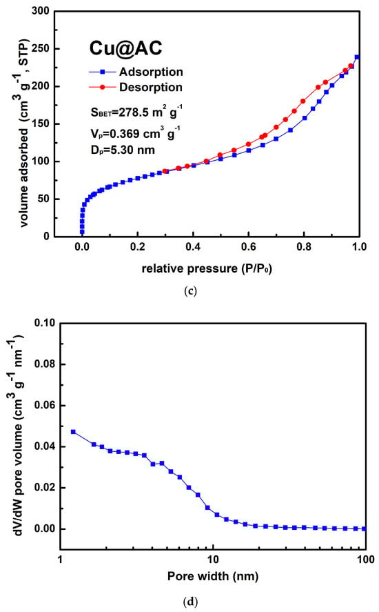 Figure 4a shows the typical morphology of the prepared Cu@AC product. As can be seen, the irregular pieces of AC attached to clusters of aggregated submicron particles. EDS confirmed that these particles were metallic Cu, as illustrated in Figure 4b. The Cu@AC product contained approximately 4.5 wt% Cu, as determined using the EDTA titration method. The adsorption–desorption curve of Cu@AC, shown in Figure 4c, exhibited a Type II isotherm with a H4 hysteresis loop, which likely resulted from the microporous characteristics of the AC serving as the support. The SBET of the Cu@AC product was 278.5 m2 g−1, which was lower than that of the raw AC (~500 m2 g−1). This reduction was likely due to the deposition of Cu, which could obstruct the pores and interior channels of the AC itself. The Vp and Dp of the Cu@AC product were measured as 0.369 cm3 g−1 and 5.30 nm, respectively.