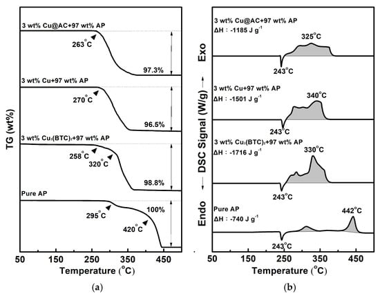Figure 5 shows the typical TG-DSC curves for pure AP and the mixtures containing 3 wt% of various copper-containing substances combined with 97 wt% AP. As shown in Figure 5a, pure AP began to experience significant weight loss at 295 °C, indicating that the thermal decomposition of AP starts at this temperature. The TG curve of pure AP exhibits two thermal weight loss stages: the first occurs between 295 °C and 340 °C (low-temperature decomposition stage, LTD), and the second occurs between 420 °C and 460 °C (high-temperature decomposition stage, HTD). The experimental results are consistent with the literature [4,5,6]. In the mixtures, the initiation temperature for decomposition shifted to a lower value, and the two-stage decomposition was less obvious. In Figure 5b, pure AP exhibits an endothermic peak at 243 °C, indicating a crystalline phase transformation from the orthorhombic to the cubic phase [5,6,7,8]. There are also two exothermic peaks at 312 °C and 442 °C, which represent the LTD and HTD stages of AP, respectively, and the latter is more intense than the former. As for the mixtures, both the LTD and HTD peaks shift to lower temperatures and even overlap; however, the endothermic peak for the crystalline transformation of AP is unaffected. It was found that adding Cu3(BTC)2, copper powder, and Cu@AC could remarkably reduce the temperature of HTD by 112 °C, 102 °C, and 117 °C, respectively.