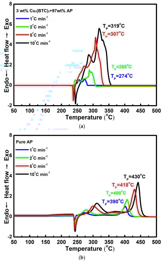 Figure 6a,b show the DSC curves for the mixture composed of 3 wt% Cu3(BTC)2 and 97 wt% AP and pure AP, respectively, at various heating rates. It can be observed that as the heating rate increases, the DSC curves shift to higher temperatures. This phenomenon can be attributed to the faster heating rate, which created a temperature gradient within the system and led to the uneven heating of the samples. Consequently, the decomposition of AP occurs at a higher temperature when a higher heating rate is applied.