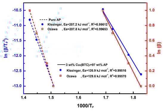 Calculation of Ea through a linear-fit relationship using Kissinger’s method [49] and Ozawa’s method [50], respectively, for pure AP and the mixture composed of 3 wt% Cu3(BTC)2 and 97 wt% AP.