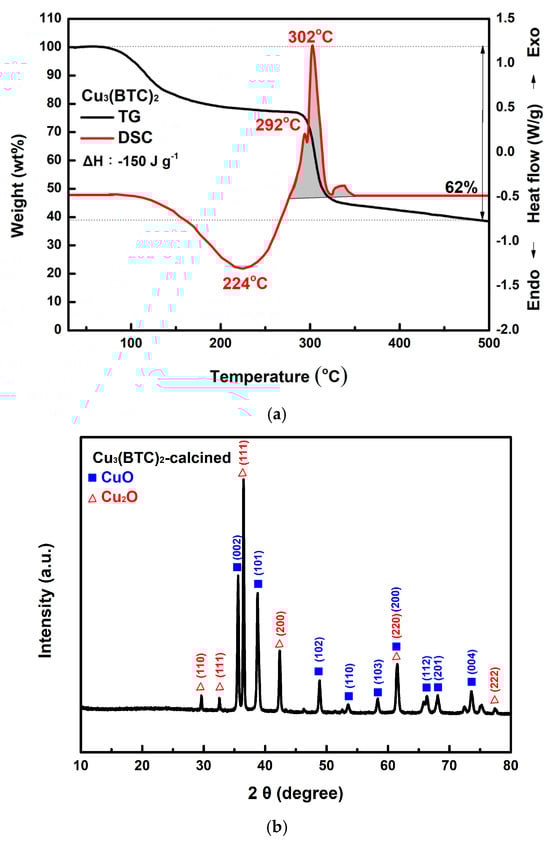 Figure 8a shows the TG-DSC curves of the prepared Cu3(BTC)2. The analysis indicates that Cu3(BTC)2 lost approximately 20% of its weight during dehydration, between 100 °C and 280 °C. Following this dehydration phase, the material decomposed, resulting in an additional ~38% weight loss between 280 °C and 310 °C. The DSC curve exhibits three exothermic peaks after 280 °C. The first two peaks are linked to H2O, CO2, and Cu2O formation. The third peak corresponds to the conversion of Cu2O into CuO [32,51]. Figure 8b shows the XRD pattern of the residue obtained after the TG-DSC analysis of the Cu3(BTC)2. The diffraction peak pattern matches the JCPDS files 45-0937 and 78-2076 for CuO and Cu2O, respectively, indicating the presence of CuO and Cu2O phases. According to the Scherrer equation [52], the crystallite size for the CuO/Cu2O residue was calculated to be ~33.8 nm.