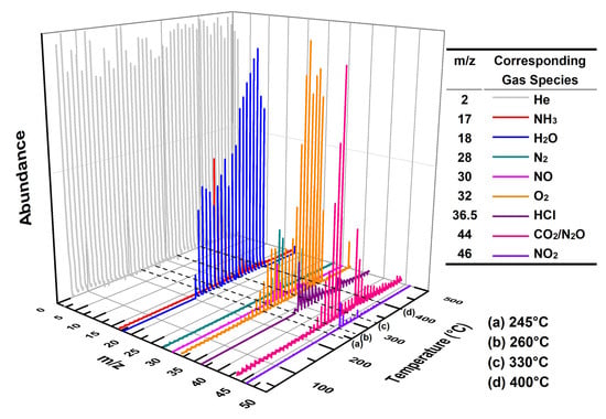 Figure 9 shows the three-dimensional EGA spectrum obtained from MS for a mixture of 3 wt% Cu3(BTC)2 and 97 wt% AP. According to the TG-DSC results for this mixture (refer to Figure 5), four key temperatures are marked in Figure 9: (a) 245 °C, indicating the crystal transformation of AP during the initial heating phase; (b) 260 °C, representing the initiation period of thermolysis; (c) 330 °C, corresponding to the peak temperature during HTD; (d) 400 °C, at which point the residual weight started to stabilize.