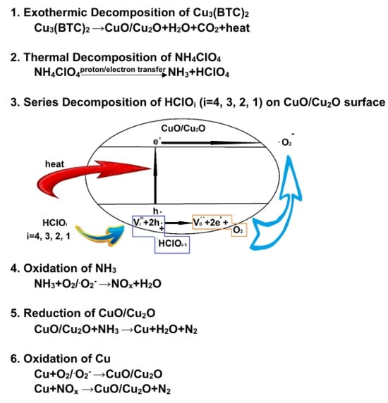 CuO and Cu2O are p-type semiconductors with relatively low energy gaps of ~1.4 eV and ~2.1 eV, respectively [58,59]. They are effective photocatalysts for producing hydrogen through water splitting [60] and degrading organic pollutants in water [61]. It is believed that CuO/Cu2O also enable the generation of thermally induced electron–hole pairs [62]. The holes produced can attract HClO4, and the oxygen atoms from HClO4 are absorbed onto the surface of the copper oxides, resulting in the formation of HClO3 and additional holes. Subsequently, oxygen molecules are released from the copper oxides’ surface, generating electrons. This process enhances electron transfer to decompose HClO4 and may even produce superoxide radical anions (). It is postulated that the exothermic decomposition of HClO4 [63] could be enhanced through the heterogeneous catalysis of CuO/Cu2O. Additionally, the deoxygenation of chlorine oxyacids may occur in a series of steps, ultimately producing HCl and O2/ (see the schematic diagram in Figure 10).