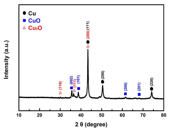 In our experiment, we mixed the prepared copper powder with AP and then dissolved the AP in deionized water. The copper powder was isolated through centrifugation. Following this process, the sample underwent vacuum drying and was analyzed using XRD. As shown in Figure 11, the results reveal the presence of characteristic peaks corresponding to the CuO and Cu2O phases, in addition to the distinct peaks of the original Cu.