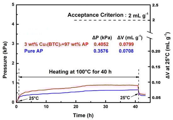 The VST was employed to evaluate the compatibility of Cu3(BTC)2 with AP. According to MIL STD-1751A, the gas released by the test sample—comprising 3 wt% Cu3(BTC)2 and 97 wt% AP—should not exceed 2 mL/g after heating at 100 °C for 40 h. The pressure–time curves for the test sample and pure AP are shown in Figure 12 for comparison.
