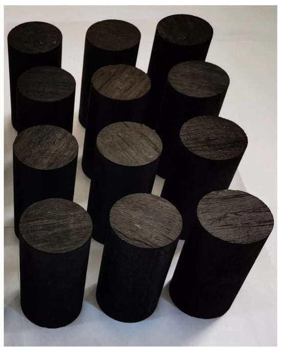 The coal specimens were taken from the Binchang coal mining field, Shaanxi Province, China, which were drilled from large coal blocks and cut into cylinders with a diameter of 50 mm and a length of 100 mm (Figure 2). In order to ensure the homogeneity of the coal specimens for the subsequent cyclic loading tests, non-destructive acoustic tests were conducted to select specimens with similar wave velocities. The uniaxial compressive strength of the coal specimens was in the range of 15–18 MPa after testing three without any visible macroscopic cracks, and the average compressive strength was 16.3 MPa. Poisson’s ratio of the coal specimen was 0.28 after measurement. The basic physical properties of the coal specimens are summarized in Table 1.