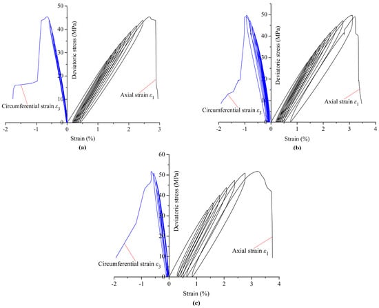A coal specimen with typical characteristics was selected from each group of the cyclic triaxial tests under the same confining pressure to analyze its deformation and failure behavior. These are the specimens C6-2, C9-4, and C12-7 under the three confining pressures of 6, 9, and 12 MPa, respectively. Figure 4 shows the deviatoric stress (σ1–σ3)–strain (ε) curves of the coal specimens under the three different confining pressures. It can be seen from Figure 4 that the peak deviatoric stress increases with increasing confining pressure, and, thus, the bearing capacity of the coal specimen is improved. The reason for this is that the high confining pressure can inhibit the initiation and expansion of cracks in the specimen [23]. The peak deviatoric stresses at the failure of the specimens under the three confining pressures of 6, 9, and 12 MPa are 45.38, 49.04, and 52.35 MPa, respectively, increasing by 15.36% from the lowest to highest confining pressures in the tests. The axial strain at failure also gradually increases with increasing confining pressure, reaching an increase of 21.43%. However, the circumferential strain at failure does not increase significantly with increasing confining pressure because the high confining pressure restricts the circumferential deformation of the coal specimens (Figure 4c). The deviatoric stress drops rapidly after reaching peak stress under low confining pressure (Figure 4a,b) but an increase in the axial strain is still maintained before the final stress drop under high confining pressure (Figure 4c). The transition from brittle to ductile deformation in coal or rock specimens may occur with increasing confining pressure if the confining pressure is high enough.