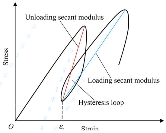 In the stress–strain curves of the coal specimens under cyclic loading and unloading, each unloading curve and the next loading curve together form a closed loop, known as a hysteresis loop, as shown in Figure 6. The formation of the hysteresis loop is due to the irreversible damage in the coal specimens during cyclic loading and unloading, such as the initiation and propagation of microcracks and friction between them, which also reflects the dissipation of energy in this process. The hysteresis loops shown in Figure 4 and Figure 5 change from dense to sparse and their area increases, indicating that the irreversible plastic deformation and damage accumulation increase with the continuous cyclic loading. The cyclic loading frequency and amplitude, and the discretization of the strength between coal specimens, might lead to an unequal number of hysteresis loops or cycles in the testing process.