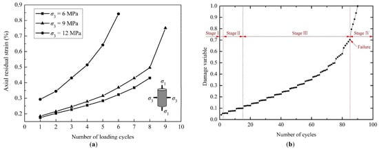 The residual strain (εr) reflects the irreversible deformation of the coal specimens after unloading, which is defined as the strain at the end of each unloading cycle (Figure 6). The variations in the axial residual strain with the number of loading cycles are given in Figure 7a. At the initial stage of the loading cycles, the axial residual strain increases slowly, especially for the specimens under relatively low confining pressures. As the number of loading cycles increases, the axial residual strain increases rapidly, and a sharp increase in the axial residual strain occurs in the ultimate failure process of the specimens. Therefore, the increasing rate of the axial residual strain becomes higher as the cyclic load continues. The specimen failure under cyclic loading is a result of progressive accumulation of damage to failure. The law obtained from Figure 7a is almost consistent with the variation in the damage variable defined by the axial residual strain reported by Zhu et al. (2020) (Figure 7b) [23]. It can also be observed from Figure 4 and Figure 7 that the axial residual strain at the end of the final unloading cycle increases with increasing confining pressure but the increase is not obvious for the circumferential residual strain.