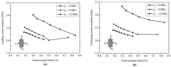 The curves of secant modulus versus axial residual strain under different confining pressures: (a) loading stages; (b) unloading stages.