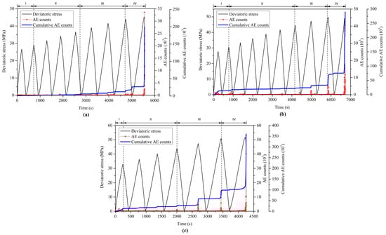 Figure 10 and Figure 11 show the AE characteristics of coal specimens during the cyclic loading tests under three different confining pressures. The AE parameters exhibit different characteristics at various stages corresponding to the deformation and failure processes of the coal specimens. The multi-stage descriptions of the AE parameters of rocks have also been reported in previous experimental studies [23,26,34] but differ from those of this study due to the different experimental methods and specimen materials. The AE responses of the coal specimens under cyclic triaxial compression with increasing stress amplitudes are unclear and need further studies. As presented in Figure 10, in the initial stage of cyclic loading (I), the original pores and microcracks in the coal specimens are compacted and closed, resulting in a small number of AE counts. This initial compaction process usually lasts for a short period of time. The degree of AE activity in the initial compaction stage depends strongly on the original defect density and damage state of the coal specimens. As the cyclic axial load continues, the elastic behavior begins to dominate the stress–strain relationship after the compaction stage. The second stage of cyclic loading (II) usually corresponds to the quasi-elastic deformation stage in the stress–strain relationship of the coal specimen. There is almost no significant increase in AE counts at this stage because the load level is not sufficient to cause the initiation of new microcracks. The curves of cumulative AE counts show approximately horizontal linearity in the quasi-elastic deformation stage, indicating that the AE activity in the coal specimens remains relatively quiet. However, the crack closure or opening can take place without disturbing the linearity in the stress–strain behavior [29]. After stage II, the irreversible plastic deformation of the coal specimens increases with the continuous cyclic axial loading. The initiation and growth of numerous microcracks occur in the third stage of cyclic loading (III), resulting in a relatively large number of AE counts. The AE activity begins to be more active in stage III, and the demonstrable Kaiser effect [35] can be found in this stage, as shown in Figure 10b,c. The frictional motion between the flanks of existing cracks may generate repeated AE signals by the stick and slip processes during the repeated loading of a specimen [36]. In the final stage of cyclic loading (IV), these microcracks inside the coal specimens gradually coalesce and propagate to form macroscopic fractures, ultimately causing specimen failure. The AE counts and cumulative AE counts increase rapidly in the final stage due to the development of microcracks and macroscopic fractures and reach their maximum values near the peak stress at failure. It can be seen from Figure 10 that the peak values of AE counts and cumulative AE counts gradually increase with increasing confining pressure. The evolution of AE counts corresponds to the complete failure process of the coal specimen from damage accumulation to macroscopic fracture.