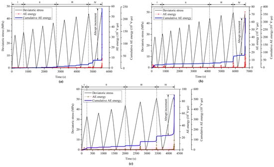 The characteristics of AE energy are similar to those of AE counts during cyclic loading tests, as shown in Figure 11. The AE energy is usually proportional to the squared waveform amplitude of an AE event or signal [37,38], reflecting the relative intensity of the released energy during the fracturing process. The AE energy is sometimes defined as the area under the envelope curve of voltage versus time [9,39]. In the initial compaction and quasi-elastic stages (I and II), the AE energy is at a low level and the curves of the cumulative AE energy remain flat at a low level. However, the AE energy and cumulative AE energy begin to increase rapidly in the stages of microcrack growth and macroscopic fracture (III and IV), and they increase abruptly to the maximum level when the coal specimens fail. The abrupt increment in AE energy in the final loading cycle can be determined by the difference between the maximum value and the last flat level of the cumulative AE energy (Figure 11). These abrupt increments in AE energy under three confining pressures of 6, 9, and 12 MPa account for 86.47%, 74.53%, and 73.28% of the total cumulative AE energy, respectively. Therefore, most of the released AE energy occurs in the macroscopic fracture process induced by rapid crack development in the final loading cycle, although the previous accumulation of irreversible damage like microcrack growth contributes to the occurrence of this process. The released AE energy in the damage and failure processes of the coal specimens increases with increasing confining pressure. Under high confining pressure, more input energy is required to drive the specimen to fail and, correspondingly, the release of more strain energy stored inside the specimen leads to more severe failure of the specimen.