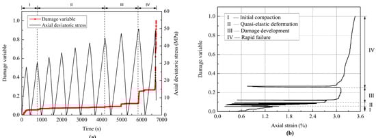 Here, we take one of the confining pressure conditions as an example to analyze the damage evolution in the coal specimen under cyclic loading, as shown in Figure 12. The changes in the damage variable are consistent with those of the cumulative AE counts in Figure 10. The damage variable increases slightly in the initial stage of cyclic loading (I), which is attributed to the closure of some primary pores and microcracks and the friction between them with increasing compaction. As the loading cycle increases, the damage variable remains almost unchanged during the period of 1000–4500 s, as shown in Figure 12a. This phenomenon is due to the fact that the coal specimen maintains the quasi-elastic deformation in the second stage (II) and there is little AE activity in the specimen. Subsequently, the damage variable begins to increase rapidly in the third stage (III) with the growth and propagation of microcracks in the specimen, and it increases significantly at the maximum stress in the last cycle of the third stage. In the final stage (IV), the damage variable increases sharply with the occurrence of macroscopic fractures and the eventual failure of the specimen. Correspondingly, the relationship between the damage variable and axial strain from the testing data shows similar multi-stage characteristics, including initial compaction, quasi-elastic deformation, damage development, and rapid failure, as shown in Figure 12b. When the axial strain decreases, the damage variable remains nearly constant, manifesting as approximately horizontal lines in Figure 12b. When the axial strain increases and exceeds the strain threshold that induces damage, the damage variable begins to increase, particularly in stages III and IV. Actually, it can be observed from Figure 12 that the coal specimen undergoes a progressive damage accumulation before its final sudden failure. It is the damage accumulation that brings about the failure of the heterogeneous coal specimens under cyclic loading.