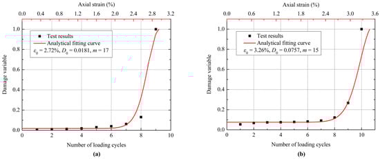 According to the definition of the damage variable in Equation (10), the damage accumulation in each cycle during the cyclic loading process can also be calculated. The loading process in each cycle can be regarded as a monotonic loading on the specimen with initial damage. Figure 13 shows the damage evolution of the coal specimens with increasing loading cycles from the experiments and their fitting curves obtained by Equation (12). It can be seen from Figure 13 that the cumulative damage law obtained by the proposed damage model is in good agreement with that from the experiments under cyclic loading conditions. An obvious feature in Figure 13 is that there is a sharp increase in the damage variable before the specimen failure, indicating that the microcracks propagate and coalesce rapidly within the specimen to form macroscopic fractures in the ultimate failure process.