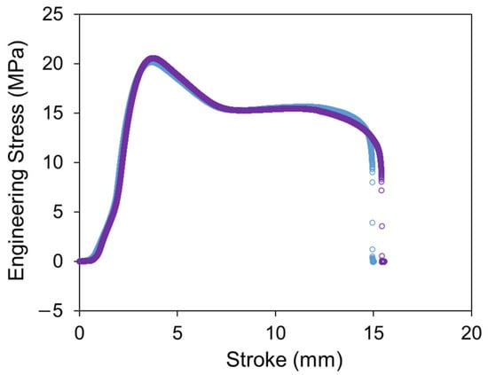 Engineering stress versus stroke of uniaxial tensile tests on two PE-Xa NPR specimens.