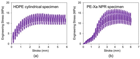 Engineering stress versus stroke in RR test on (a) HDPE cylindrical specimen and (b) PE-Xa NPR specimen.