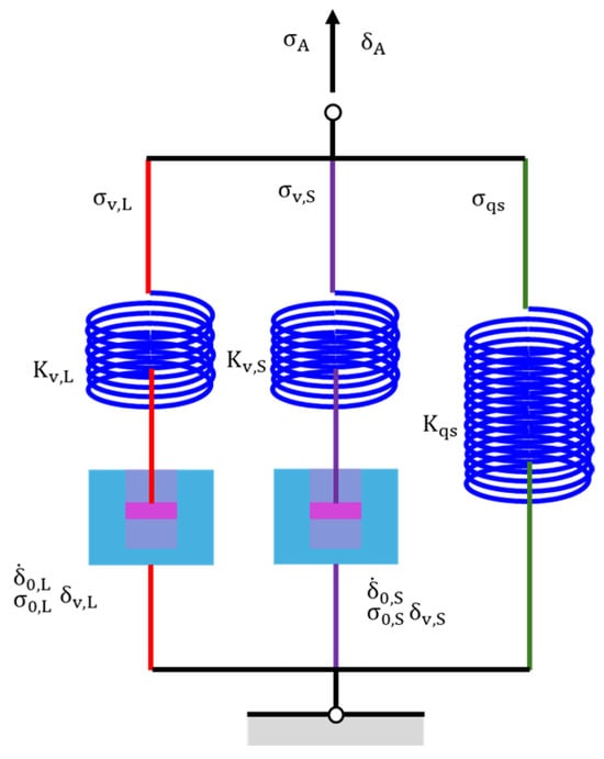 It is widely accepted that the one-branch model is insufficient to describe the relaxation behavior of PE, as the applied stress in PE consists of both time-dependent and time-independent components [20]. Tan and Jar [23] found that the relaxation behavior of PE can be described by a two-branch spring-dashpot model with a single dashpot. Although the long-term relaxation behavior can be mimicked well, the accurate simulation of the short-term relaxation behavior was missed. Our previous work [24] found that the two-branch spring-dashpot model, with two dashpots connected either in series or in parallel, failed to simulate the unusual stress response observed during the recovery behavior of HDPE. Recently, it was reported that the three-branch model can accurately simulate the relaxation and recovery behavior of HDPE [27]. In this paper, the three-branch model is adopted to analyze the stress relaxation from the RR tests, which is shown in Figure 3. The three-branch model contains long-term viscous branch, short-term viscous branch, and quasi-static branch, which are denoted using subscripts L, S, and qs. In our previous work [27], it was found that the long-term viscous branch is capable of capturing the time-dependent, long-term viscous stress (the component in PE with a longer characteristic relaxation time). The short-term viscous branch is capable of capturing the time-dependent, short-term viscous stress (the component in PE with a shorter characteristic relaxation time). The quasi-static branch is capable of capturing the time-independent stress (the time-independent component in PE). The prediction ability of the model was examined in our previous work [27], and the results indicate that the values from the prediction of long-term viscous stress in the relaxation stage show a consistent trend of variation with long-term viscous stress calculated in the following recovery stage and a study to evaluate the model’s performance under different deformation scenarios and further assess its predictive capability when this manuscript was prepared. This model and its governing equations can also be found in our previous work [27]. Therefore, the stress change during each relaxation (recovery) stage can be written as follows: