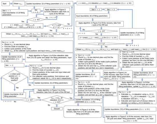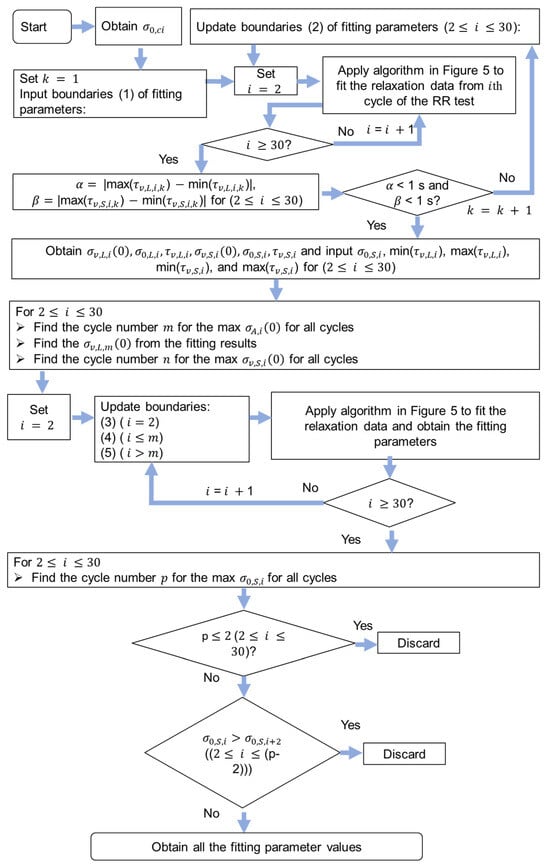 The details of the mode method for the determination of the model parameter values in the relaxation and recovery stages of RR tests are shown in Figure 4, which were also illustrated in the previous work [27]. Equation (1) was used to fit the relaxation data and recovery data, and all the fitting parameter values in the relaxation and recovery stages were obtained. Because 28 cycles of the RR test for the NPR specimen were collected, 28 was used in the flow chart in Figure 4. For the determination of the fitting parameters in the relaxation stages in Figure 4, the ranges of values were first obtained. It is important to note that the ranges of and values were narrowed down until their variation for the entire RR test was less than 1 s. The ranges of and were determined using their averages in the 28 relaxation stages. The ranges and plateau for and were calculated using their modes. A plateau region from around 3 mm to 6 mm in Figure 2a was observed, and the plateau region of model parameter values during deformation was also reported in the literature [23,24]. Therefore, values were assumed to show the plateau region during deformation. In addition, quasi-static stress () values were assumed to be the same for the relaxation and the recovery stages at the same deformation level, which is consistent with the finding reported in the literature [29,30]. It should be noted that the mode for this method represents the mathematical concept, that is, the most common number that appears in one set of numbers. The initial boundaries for the six fitting parameters in the relaxation stages are [0.1, 20] (in MPa) for , (in MPa) for , (in s) for , (in MPa) for , (in MPa) for , and (in s) for . From Figure 4, index in the flow chart is used to represent the cycle number for the RR test so that the fitting parameter values of each cycle of the RR test can be determined. Values for reference stress (), with subscript denoting the cycle of the RR test, were determined using the curve fitting method proposed in the literature [23]. That is, values were calculated by fitting the short-term behavior of the relaxation stages using a standard model with a single Eyring’s dashpot. Notably, the terms ‘max’, ‘min’, and ‘avg’ represent operations for determining the maximum, minimum, and average values within an array, respectively. The ranges of the boundaries used in Figure 4 are shown in the Supplementary Materials.