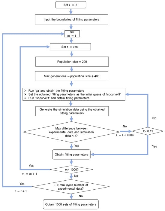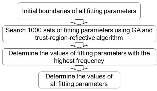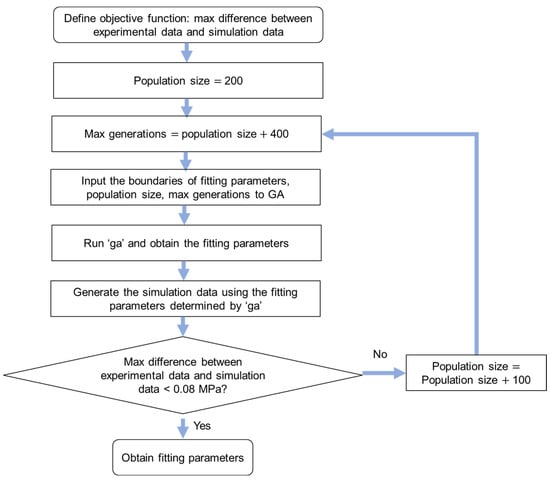 A genetic algorithm was used to search for the optimal model parameter values and is shown in Figure 5. Function ‘ga’ in MATLAB was used to implement the genetic algorithm. The upper boundary of the population size is 1500, hence the max difference between experimental data and simulation data was checked after running the algorithm shown in Figure 5. The programming in Figure 4 can be terminated and restarted when the max difference between experimental data and simulation data is larger than 0.08 MPa. Therefore, the max difference between experimental data and simulation data from results using the mode method is less than 0.08 MPa, and this value is much smaller than the values reported in the literature, such as 0.17 MPa [30], 0.3 MPa [31], 0.4 MPa [23], and 1 MPa [32].